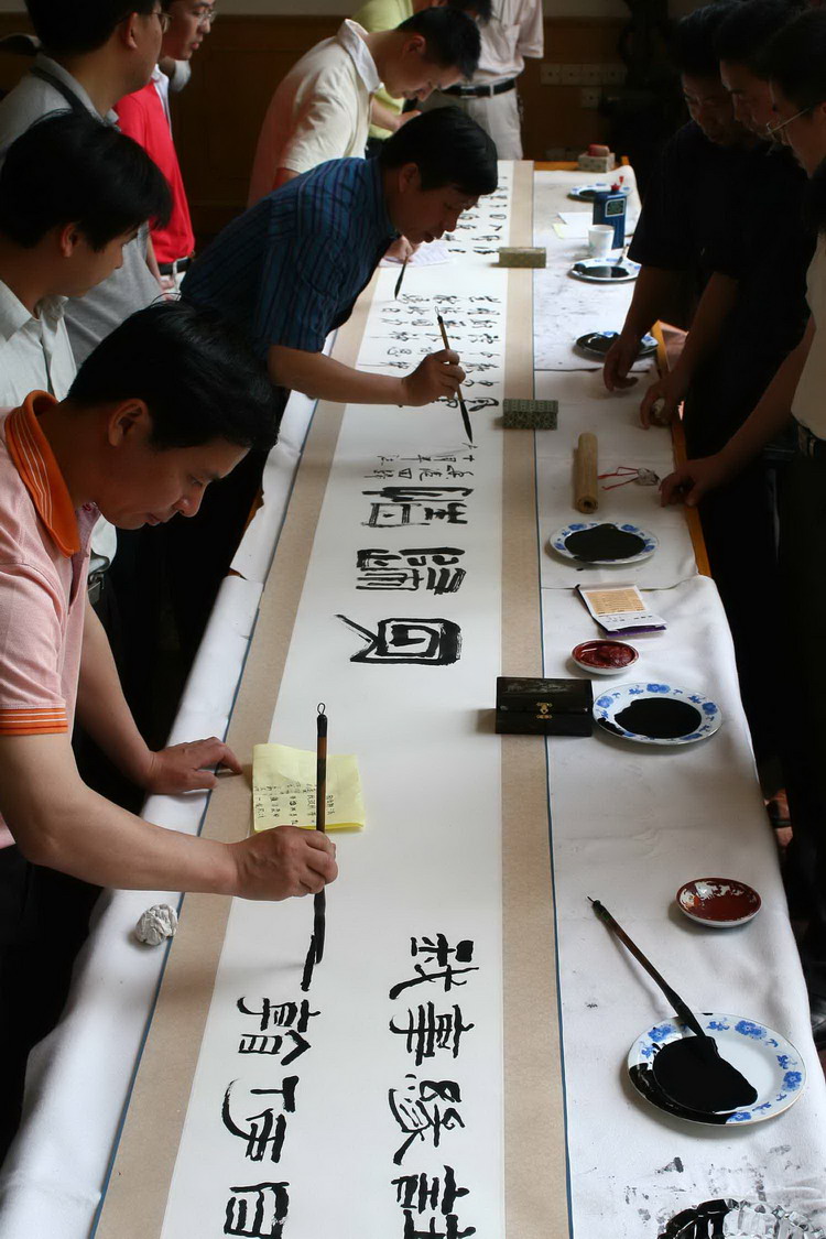 与会书法家进行了现场书法表演和集体长卷创作。现场气氛热烈,艺术氛围浓郁,大家满怀激情,即兴创作了风格各异的书画作品七十余件,书作或龙飞凤舞,或凝重雅致,潇洒中富有韵律,宁静中蕴涵悠远,字字珠玑,笔到意到。以“爱我中华”为主题的三十多米长卷,犹如布满星星的璀璨星河,灵动耀眼,字里行间表达了书法家们对香港回归十周年来所取得成就的热情讴歌,对和谐盛世的由衷赞美。