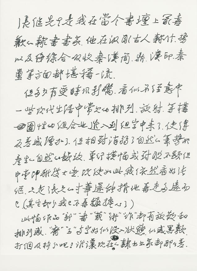 此幅作品“新”“书”“艺”“术”“作”都有放散和排列感。“齐”“玉”等字好似没入状态,似感异类。打个及格分吧!谁让现在人隶书书家都那么差。 |