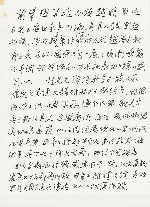 前辈越写越内敛,越精简越不容易看出来其内涵。年青人越写越外放,越外放若笔法有功力就越容易表露出来,多好的感觉只有一层(技法)华丽而单调。虽然很多人力求把表面上搞得热热闹闹的。 程光兄深得新加坡大家潘受之真传,又精研好大王碑经年,虽个头很大,心思缜密,慊和内敛,观其字几可类比其人,交游广泛,每到一处皆极认真切磋书艺,如此阅经历,使他的字的内涵相当充实。近来又推动甲骨文书法,想必又在汲取远古之干练之营养了,相信定有助益。