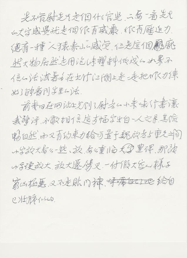 前几日在网站上见到了尉老的小米味行书让我惊讶,不敢相信这两幅字出自己一个人之手,其流畅自然,而又有约束力恰可置于魏启老与曹兄之间,小字放大要么一点点放,要么重临巨碣丰碑。哪能小字硬放大,放大还劈叉,一付假大空的样子,穷凶极恶,又不是帖门神,给自己壮胆似的。
