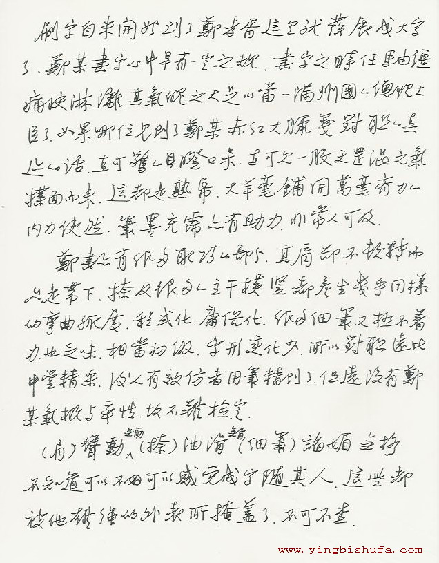 郑书亦有很多取巧的部分,高肩却不顿转而只是带下,捺及很多的主干横竖都产生几乎同样的弯曲孤度,程式化、庸俗化,很多细笔又极不着力,也乏味,相当初级,字形变化少,所以对联远比中堂精彩,后人有效仿者用笔精到了,但远没有郑某气慨与率性,故不难检定。