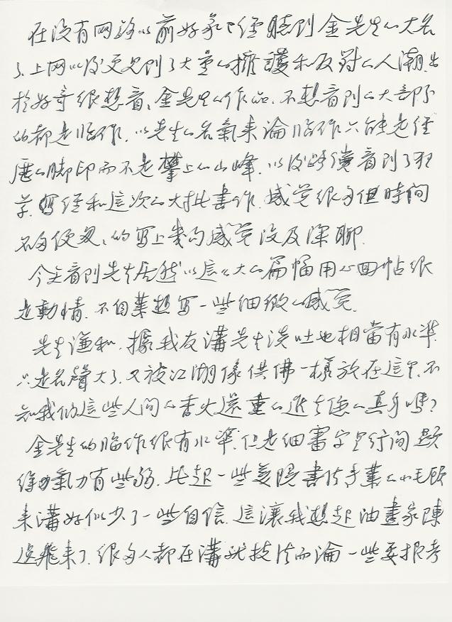 金先生的临作很有水准,但是细审字里行间显得气力有些弱,比起一些美院书法专业的小毛头来讲好似少了一些自信,这让我想起油画家陈逸飞来了,很多人都在讲就技法而论一些要报考。