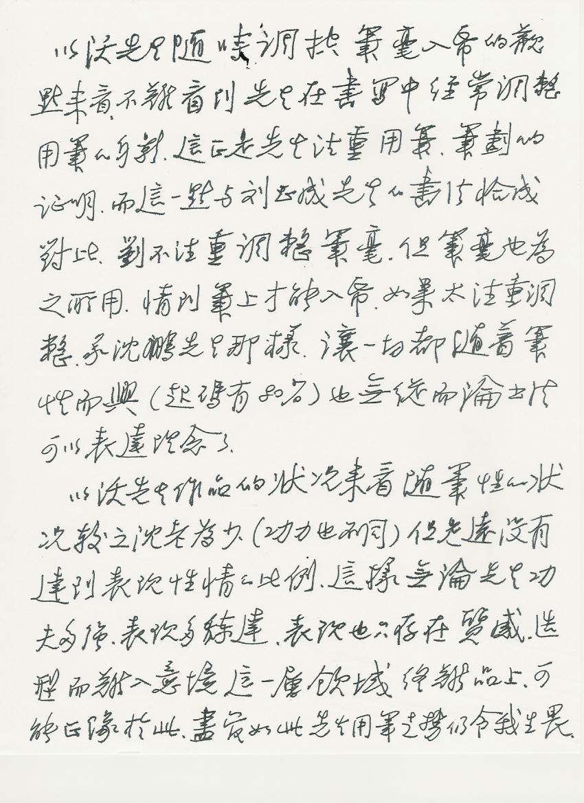 以沃先生随时调控笔毫入纸的观点来看,不难看到先生在书写中经常调整用笔的身影,这正是先生注重用笔、笔画的证明。而这一点与刘正成先生的书法恰成对比,刘不注重调整笔毫,但笔毫也为之所用,情到笔上才能入纸,如果太注重调整,象沈鹏先生那样,让一切都随着笔性而兴(起码有80%)也无从而论书法可以表达理念了。