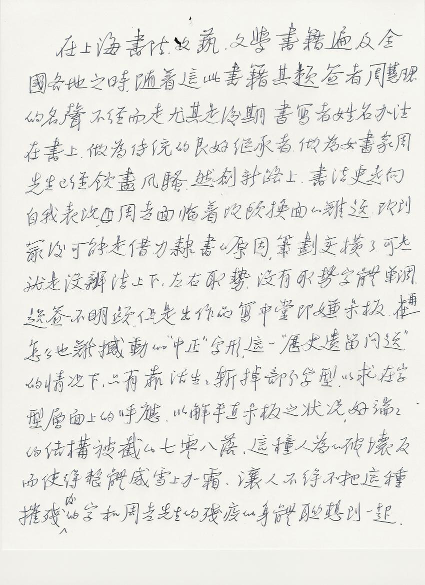 在上海书法、文艺、文学书籍遍及全国各地的之时,随着这些书籍其题签者 周慧珺的名声不径而走,尤其是后期书写者姓名加注在书上。做为传统的良好继承者,做为女书家周先生已经领尽风骚,然创新路上,书法更走向自我表现,周老面临着改头换面的难题,改到最后可能是借刀隶篆书的原因,笔画变横了,可是就是没办法上下,左右取势,没有取势字体单调,题签不明显,但是出作品写中堂即嫌呆板,再怎么也难撼动的“中正”字形,这一“历史遗留问题”的情况下,只有靠活生生斩掉部分字型以求在字型层面上的呼应,以解平直呆板之状况,好端端的结构被截得七零八落,这种人为的破坏反而使得整体感雪上加霜,让人不得不把这种摧残后的字和周先生的残疾的身体联想到一起。 |