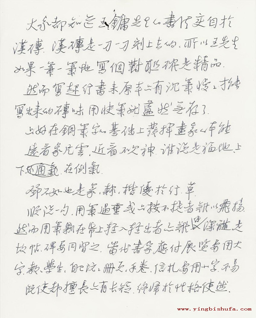 顺说一句,用笔过重或只按不提者难以飞扬。然而用笔飘在纸上轻入轻出者亦难得深髓,是故帖、碑要同习之,当代书家应付展览要用大家,教教学生、自己玩玩册页、手卷、信札要用小字,不易。