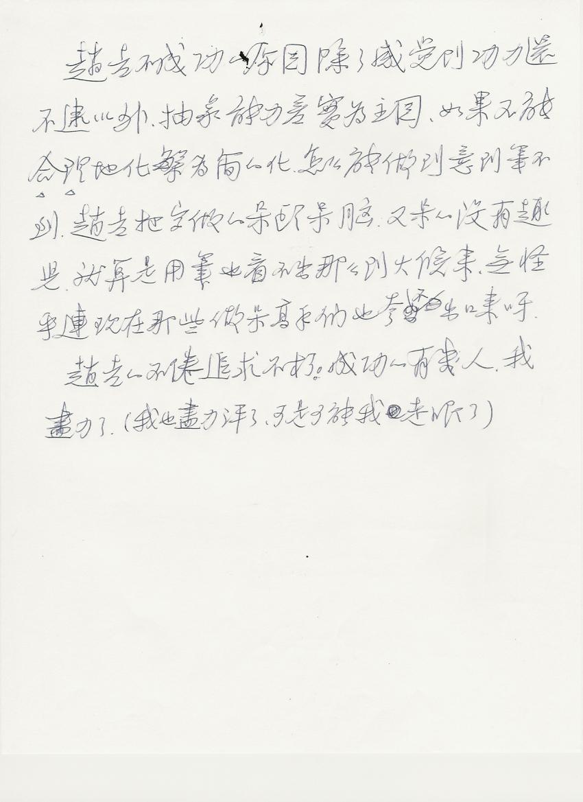 赵老不成功的原因除了感觉到功力还不逮以外,抽象能力差实为主因,如果不能合理地化繁为简的话,怎么能做到意到笔不到。赵老把字做得呆头呆脑,又呆得没有趣儿,就算是用笔也看不出那么到火候来,无怪乎连现在那些做呆高手们也夸不出口来呀。