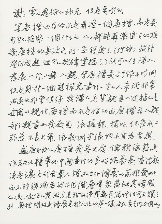 写唐楷的目的不是再造一个唐楷,而是要用它的框架,一个什么七七八八都能再装进去的框架,唐楷的基础打到一定程度了。(理解了,技法运用成熟,组字的规律掌握了)就可以往深入发展,入行、入隶、入魏,学唐楷要占去很多时间,但是对于一个想探究书法一生的人来说非常必要也是非常值得,我讲的先写魏再入行,指的是企图以魏代唐楷而不是指由唐楷再入魏,部份魏书如崔敬邕、张猛龙稍好,但崔刻工较差,不易见笔,张欹侧夸张均不宜为首选。