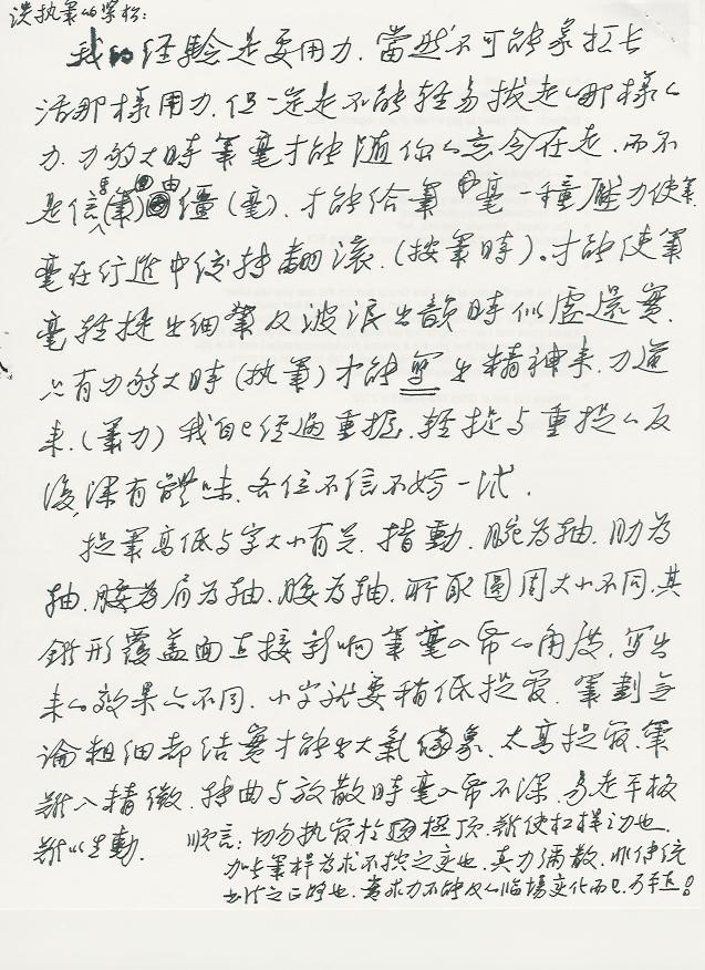 我的经验是要用力,当然不可能象扛长活那样用力。但一定是不能轻易拔走那样的力。力够大时,笔毫才能随你的意念在走,而不是信马(笔)由缰(毫)。才能给笔毫一种压力使笔毫在行进中绞转翻滚(按笔时).才能使笔毫轻提出细笔及波浪出韵时似虚还实。只有力够大时(执笔)才能写出精神来,力道来(笔力),我自己经过重握。轻捉与重捉的反复,深有体会,各位不妨一试。