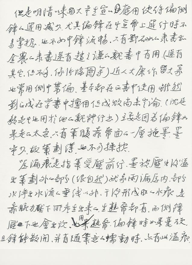 但是明清以来大量生宣的应用使偏侧锋的运用减少,尤其偏锋在生宣上运行时不易掌握,也不如中锋流畅。只是邓石如的的隶书和金农的隶书还有赵之谦的魏书有用。(还有其它的,但不多,像张瑞图等)近人大康作篆也常用侧中带偏。基本都在正书中使用。虽然刘正成在草书中擅用,但是成败尚未定论。(沈延毅先生也用于他的魏体行书)主要是因为偏锋如果走的太急。只有笔腹靠纸面的一层施墨。墨量少,故笔划薄,也不亦操控。