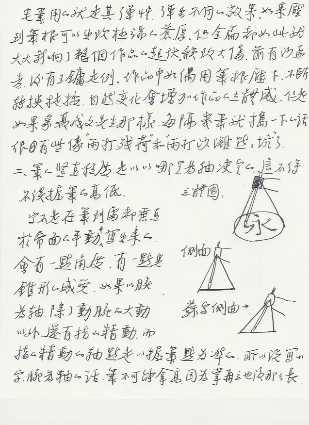 字不是在笔到处都垂直于纸面的平动中写出来的。会有一点角度。有一点儿锥形的感觉。如果以腕为轴,除了动腕的大动以外,还有指的精动。而指的精动为轴点是以握笔点为准的。所以说写小字,腕为轴的话,笔不可能拿高。因为掌再立也没有那么长。