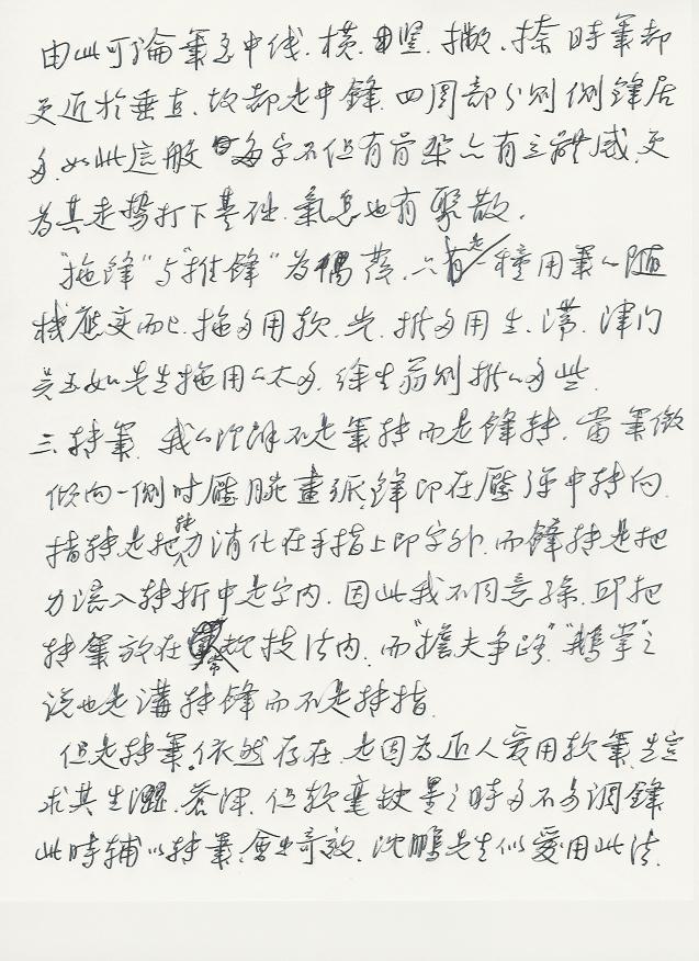 所谓笔法就是根据书写的要求提住笔发力捻动笔毫。让笔毫在纸里行走跳跃(善用其弹性)让溢出的墨痕来反映我们内心的诉求。而不是以笔写出来的效果为标准来调整我们的指头甚至头脑(去决定下一步该怎么写)前者是创作,后者是临习。