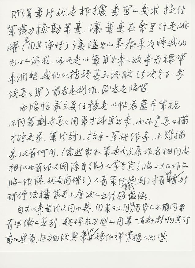 而临帖最主要任务是以帖为蓝本掌握不同笔划是怎么用笔才能写出来。而不是怎么描才能更象,笔法对了,抬手一写就很象,不对,描象了又有何用。(当然纸和笔是否与原作者相同或相似也有很大的关系,很多人拿生宣去临二王的作品临的很像,就要商確了)只有笔法基本过关了才有能力去研修结构等更上一层次的书法蕴涵。