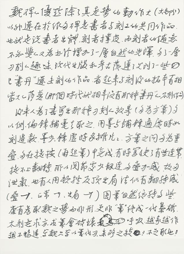 后来人为了书写出那种刀刻的效果(多为方笔)多以侧、偏锋铺毫去取之。用墨与铺锋适度时如刻边款,墨少,锋虚时象摊片片。方笔之间多为重叠,多在提按(再起笔)中完成,有时写快了有些连带提不上翻转。所以关节处少韧连。多叠加感,故多泄气。也有人用顿挫反顶出肩法似有翻转感。圆笔自然绞转多些。康有为取魏之势,而非形,更非“笔”,终成一代枭雄。太刻意求方,求笔会破坏呼吸。越象越作越不暢达。学魏只学以笔代刀,未路之技也。不足取也!