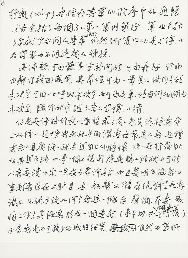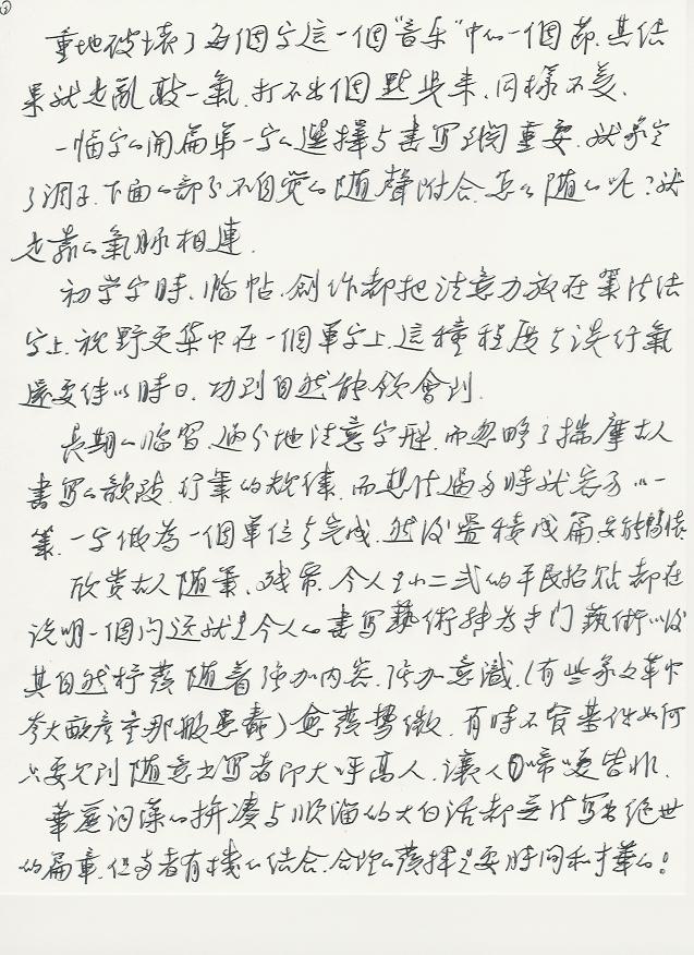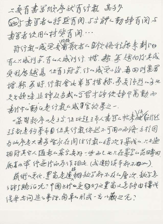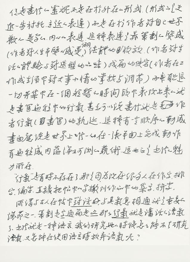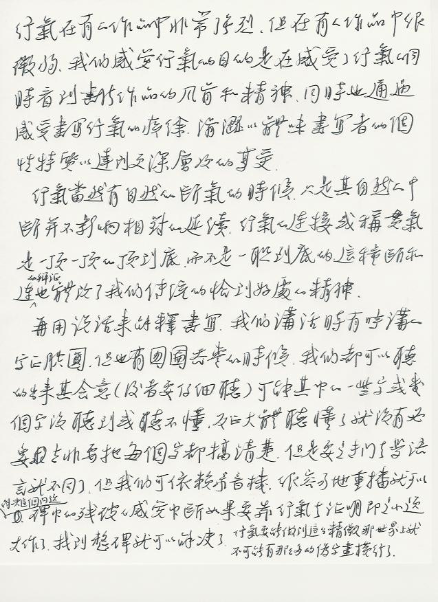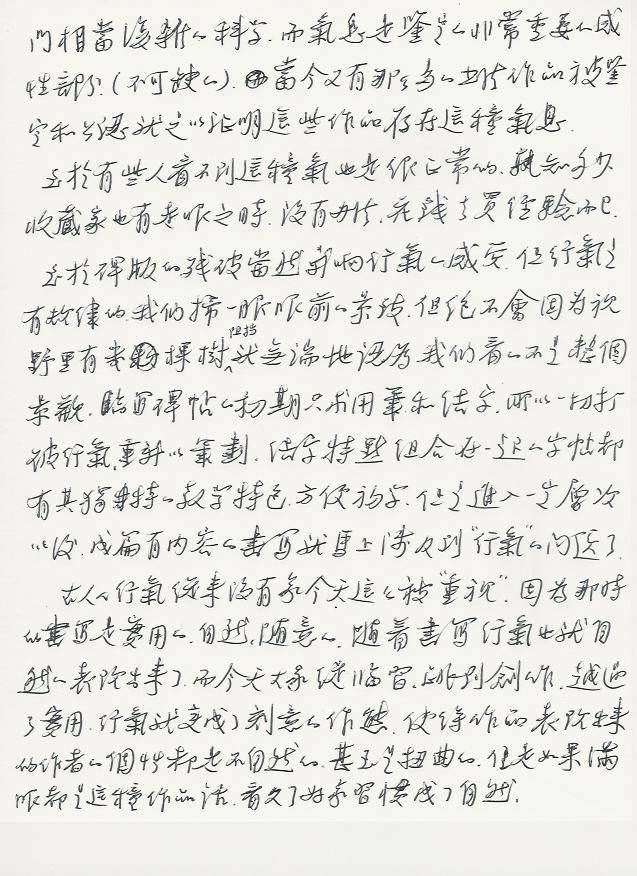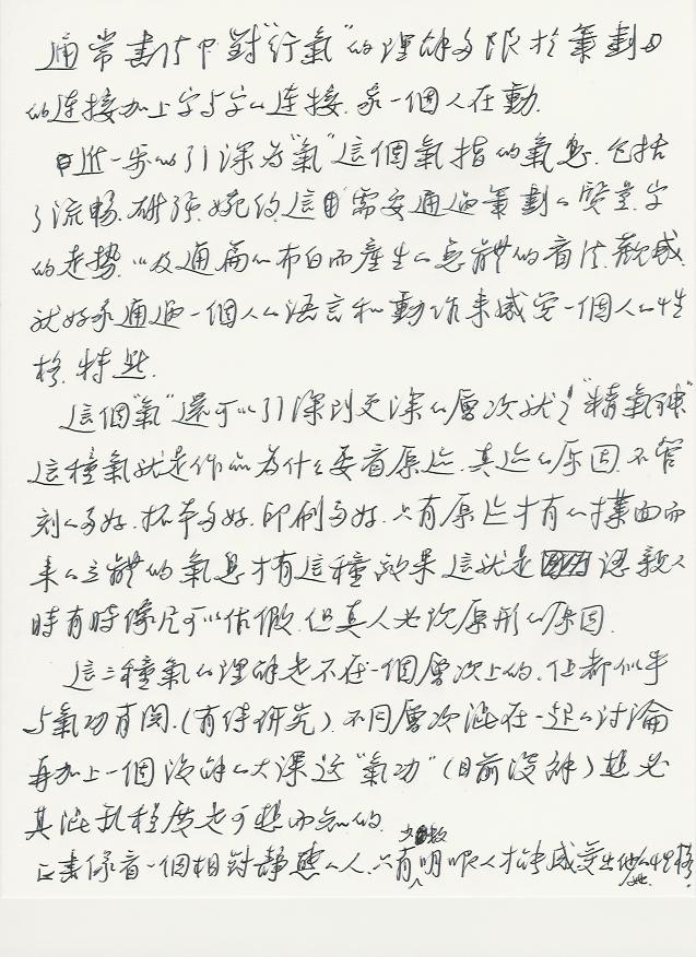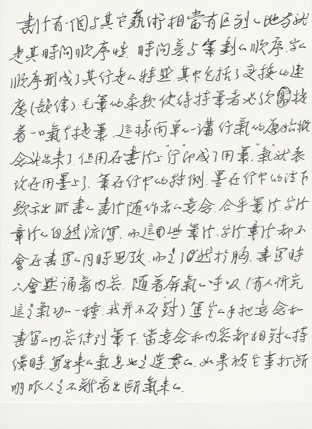 书法有一个与其它艺术想当有区别的地方就是其时间顺序性,时间差与笔划的顺序,写的顺序形成了其行走的特点,其中包括了变换的速度(韵律),毛笔的柔软使得持笔者必须提着一口气去提笔,这样简单的一讲,行气的原始概念就出来了,但用在书法上“行”即成了用笔,“气”就表现在用墨上了,笔在行中的转侧,墨在行中的注下,显示出所书的书法随作者的意念,合乎笔法,字法,章法的自然流泻,而这些笔法,字法,章法都不会在书写时思考,而是了然于胸。书写时只会默诵着内容,随着屏气的呼吸(有人研究这是气功的一种,我并不反对)笃定的手把意念和书写的内容传到笔下,当意念和内容都相对的持续时,写出来的气息也是连贯的,如果被它事打断,明眼人是不难看出断气来的。
