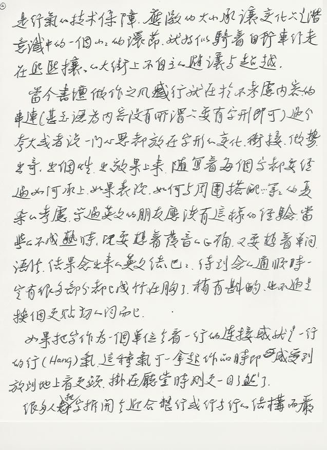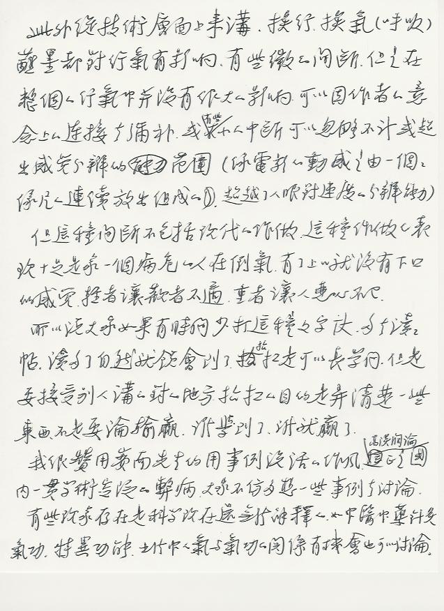 此外从技术层面上来讲,换行,换气(呼吸)蘸墨都对行气有影响,有些微的间断,但是在整个行气中并没有很大的影响。可以因作者的意念上的连接去弥补,或有些小的中断可以忽略不计或超出感觉分辨的范围(像电影的动感是由一个个像片的连续放出组成的。超越了人眼对速度的分辩能力。)