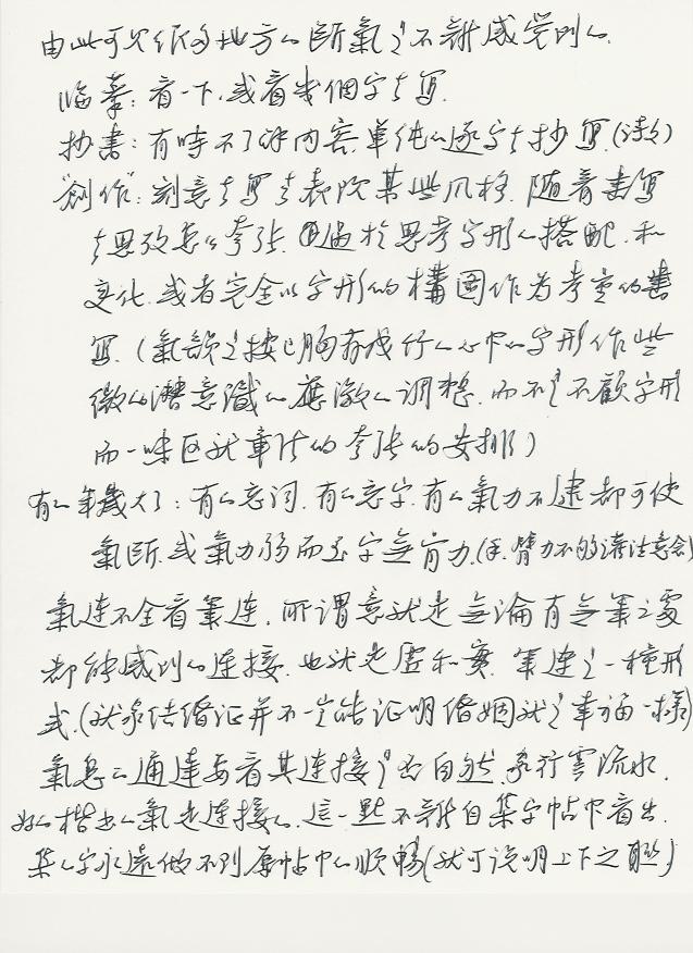 进一步的引深为“气”这个气指的气息,包括了流畅,雄强,婉约。这需要通过笔划的质量,字的走势,以及通篇的布白而产生的总体的看法,观感就好象通过一个人的语言和动作来感觉一个人的性格,特点。
