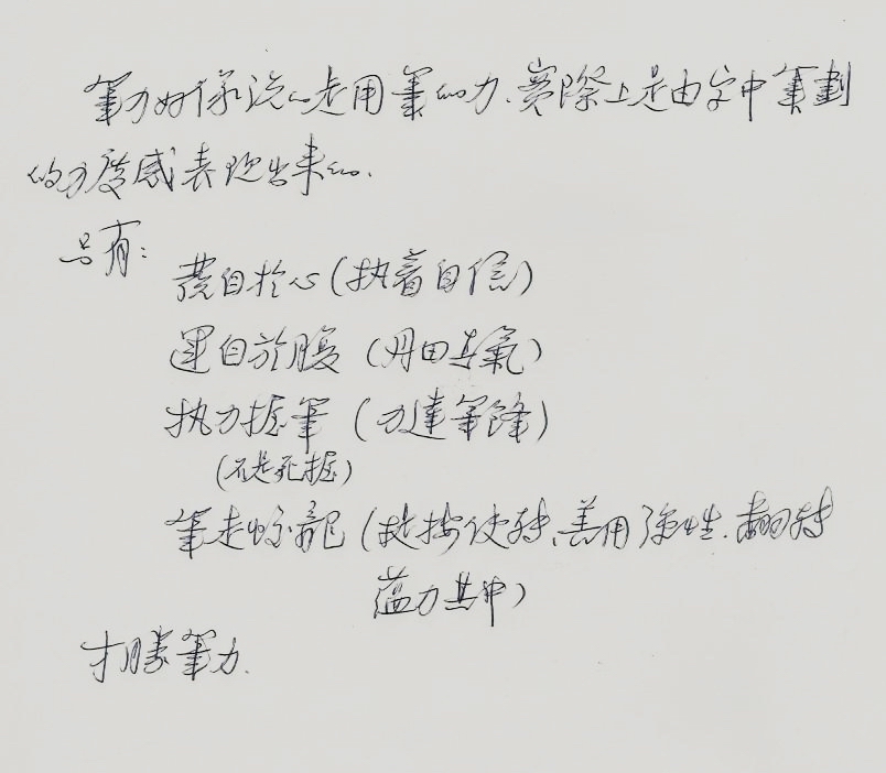 笔力好象说的是用笔的力,实际上是由字中的笔划的力度感表现出来的。 只有: 发自于心(执着自信) 运自于腹(丹田真气) 执力握笔-不是死握(力达笔锋) 笔走蛟龙(提按使转,善用弹性,翻转,蕴力其中) 才胜笔力