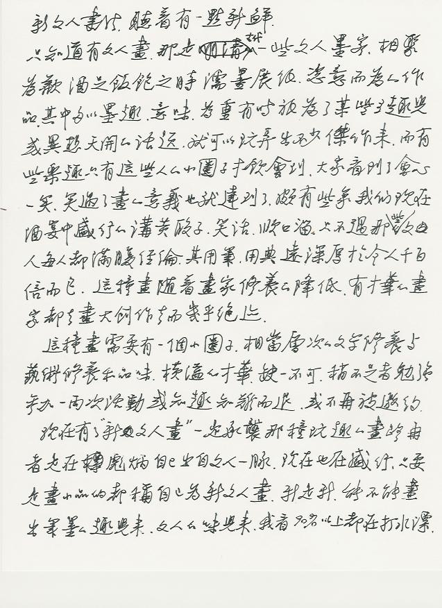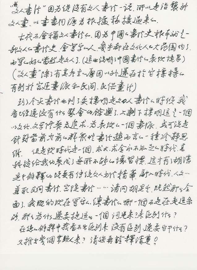 到了今天书法也到了要标明是文人书法的时候,我看已经远没有什么聚会的余兴了,只剩下标明这是一个以文化,文学修养为追求,为表现的一个书派。或可说是针对当前空前的群众性书法热而言的一种冷静思维。但是现时代是一个求大求全,永不知足的时代,高科技给我们养成了无所不能的坏习惯,这才有了胡湛先生解释的既要有传统文人书法精华,融入时代,人文......兼取民间书法,宫院书法......