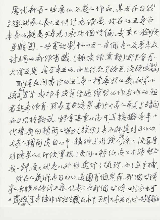 所谓民间书法的“丑”是一种原始的美,就象小孩子初学写字,或根本没有经过练习的作者作品,粗看起来很有一点象高境界书法大家的率真与精简,而且风格散乱,体会其童心尚可,直接搬过来以代替通向精简的努力(捷径)是不能达到目的的。大家的精简发自心中,精神与形态高度统一,没有达到境界的人即使掌握了民间的特征,要么不能整合成一体,要么就是以外型进行了梳理,而了无生机。