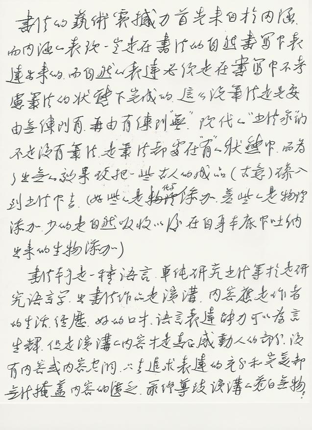 书法的艺术震撼力首先来自于内涵,而内涵的表现一定是在书法的自然书写中表达出来的,而自然的表达必须是在书写中不考虑笔法的状态下完成的。这么说笔法是先要由无练到有,再由有练到“无”。现代的“书法家”们不是没有笔法,是笔法都处在“有”的状态中,而为了出无的效果硬把一些古人的成品(古意)碜入到书法中去。(好些的是化学添加,差些的人物理添加,少的是自然吸收以后在自身本底中吐纳出来的生物添加)