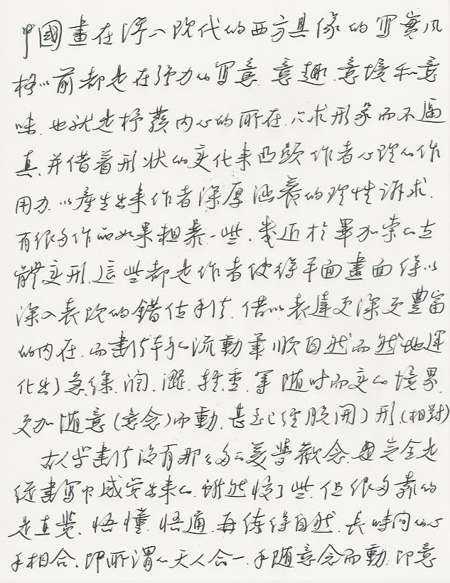 中国画在渗入现代的西方具像的写实风格以前都是在强力的写意,意超、意境和意味,也就是抒发内心的所在,只求形象而不逼真,并借着形状的变化来凸显作者心理的作用力,以产生出来作者深厚涵养的理性诉求。有很多作品如果粗暴一些,几近于毕加索的立体变形。这些都是作者使得平面画面得以深入表现的错位手法,借以表达更深更丰富的内在,而书法本身的流动笔顺自然而然地运化出了急、缓、润、涩、轻、重等随时而变的境界,更加随意(意念)而动,甚至已经脱开了形。(相对)