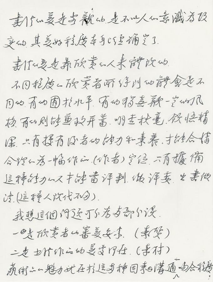 不同程度的欣赏者所得到的体会是不同的,有的囿才水平,有的独喜欢一定的风格,有的则能兼收并蓄,明查秋毫,领悟精深。只有据有后者的能力和素养,才能合情合理的为一幅作品(作者)定位,只有具备这种能力的人才能当评判,做主委,出书做注。(这种人现代不多)