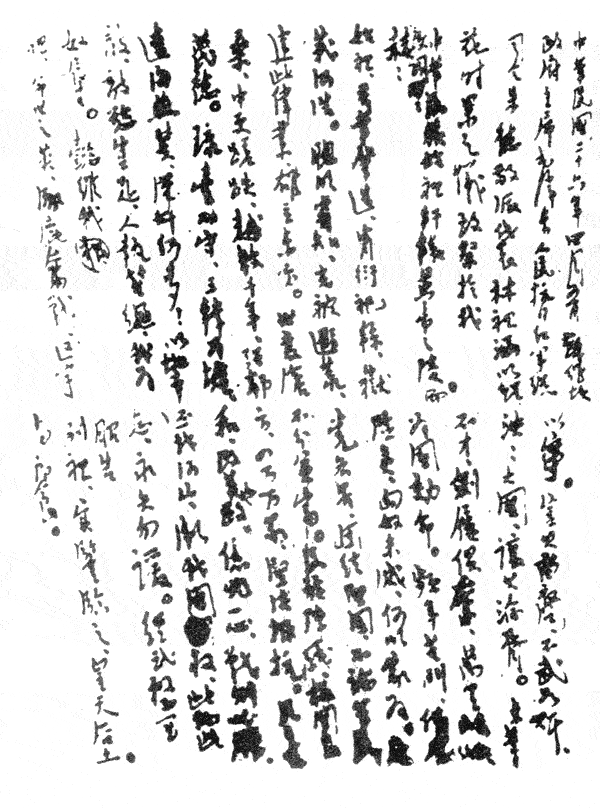 赫赫始祖,吾华肇造。胄衍祀绵,岳峨河浩。聪明睿知,光被遐荒。建此伟业,雄立东方。世变沧桑,中更蹉跌。越数千年,强邻蔑德。琉台不守,三韩为墟。辽海燕冀,汉奸何多!以地事敌,敌欲岂足?人执笞绳,我为奴辱。懿维我祖,命世之英。涿鹿奋战,区宇以宁。岂其苗裔,不武如斯:泱泱大国,让其沦胥?东等不才,剑屦俱奋。万里崎岖,为国效命。频年苦斗,备历险夷。匈奴未灭,何以家为?各党各界,团结坚固。不论军民,不分贫富。民族阵线,救国良方。四万万众,坚决抵抗。民主共和,改革内政。亿兆一心,战则必胜。还我河山,卫我国权。此物此志,永矢勿谖。经武整军,昭告列祖。实鉴临之,皇天后土。尚飨!