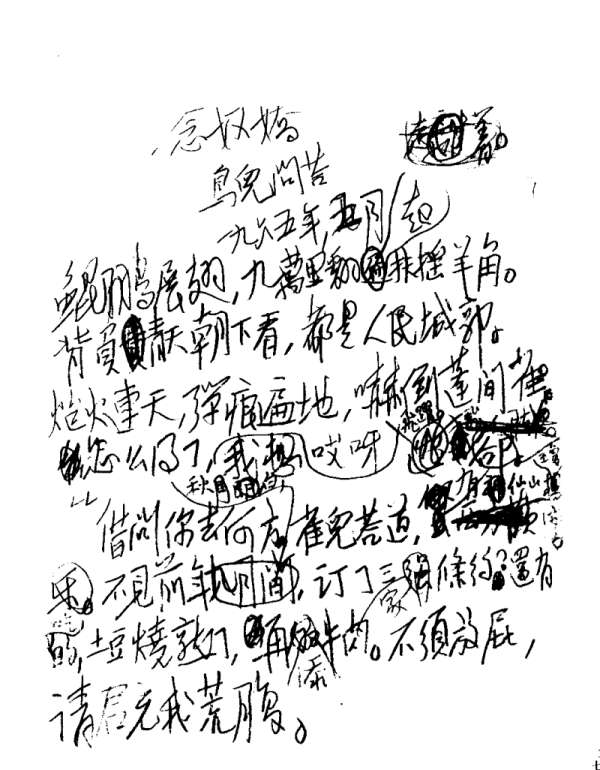 鲲鹏展翅,九万里,翻动扶摇羊角。背负青天朝下看,都是人间城郭。炮火连天,弹痕遍地,吓倒蓬间雀。怎么得了,哎呀我要飞跃。 借问君去何方? 雀儿答道:有仙山琼阁。不见前年秋月朗,订了三家条约。 还有吃的,土豆烧熟了,再加牛肉。不须放屁!试看天地翻覆。 1965年秋