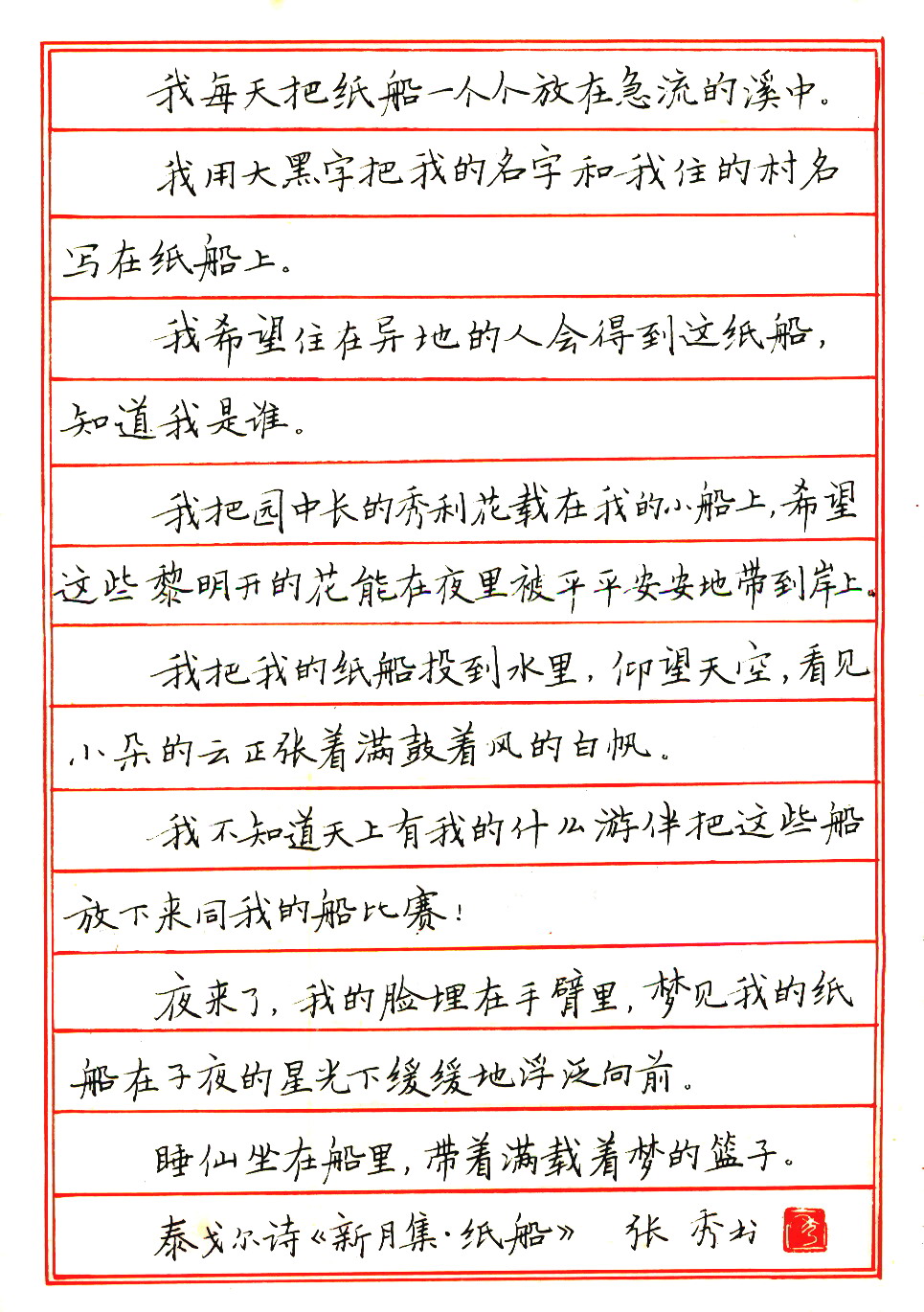 张秀硬笔楷书泰戈尔诗新月集纸船(来源:《中国钢笔书法杂志作品精选》)