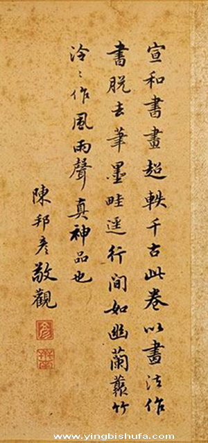 释文:此卷以画法作书,脱去笔墨畦径,行间如幽兰丛竹,泠泠作风雨声。真神品也。陈邦彦敬观。
