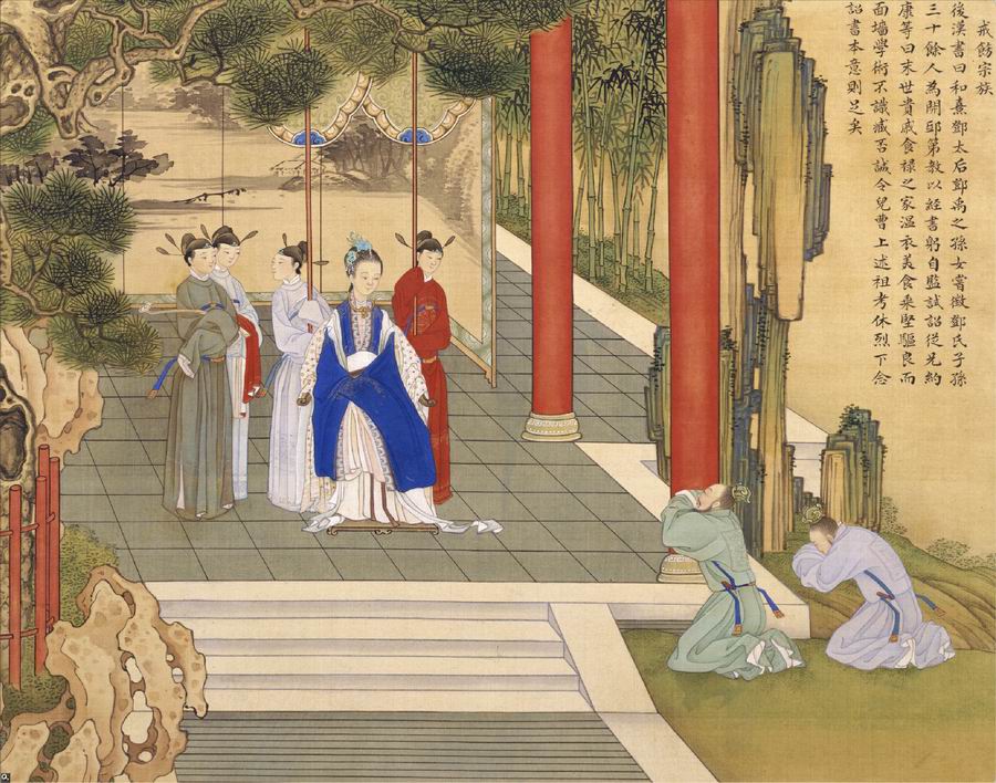 此册共12开,分别为:1、葛覃亲采,2、含饴弄孙,3、教训诸王,4、戒饬宗族,5、禁苑种谷,6、麟趾贻休,7、女中尧舜,8、亲掖銮舆,9、身衣练服,10、孝事周姜,11、约束外家,12、濯龙蚕织。