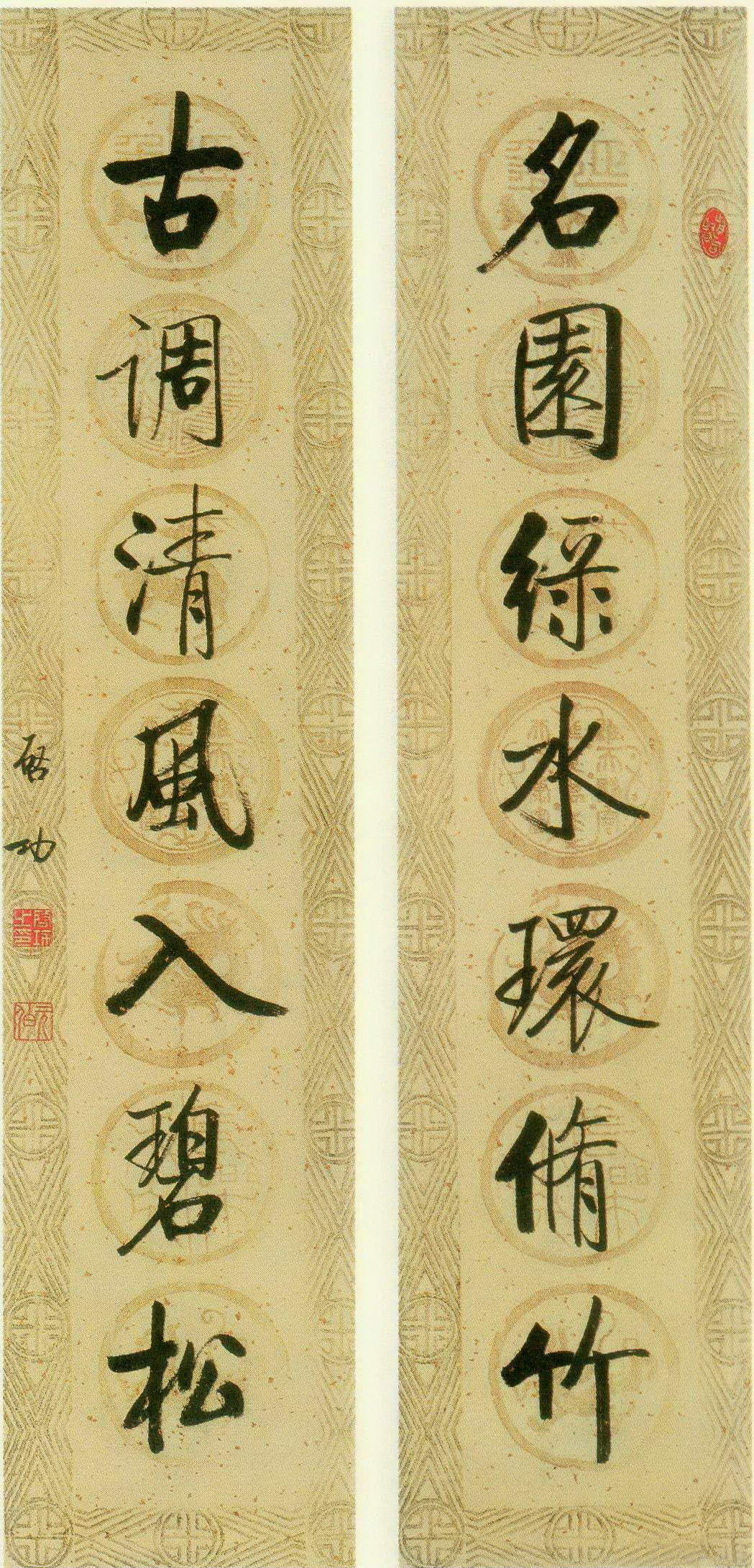 启功:楷书七言联(名园绿水坏修竹古调清风入碧松)