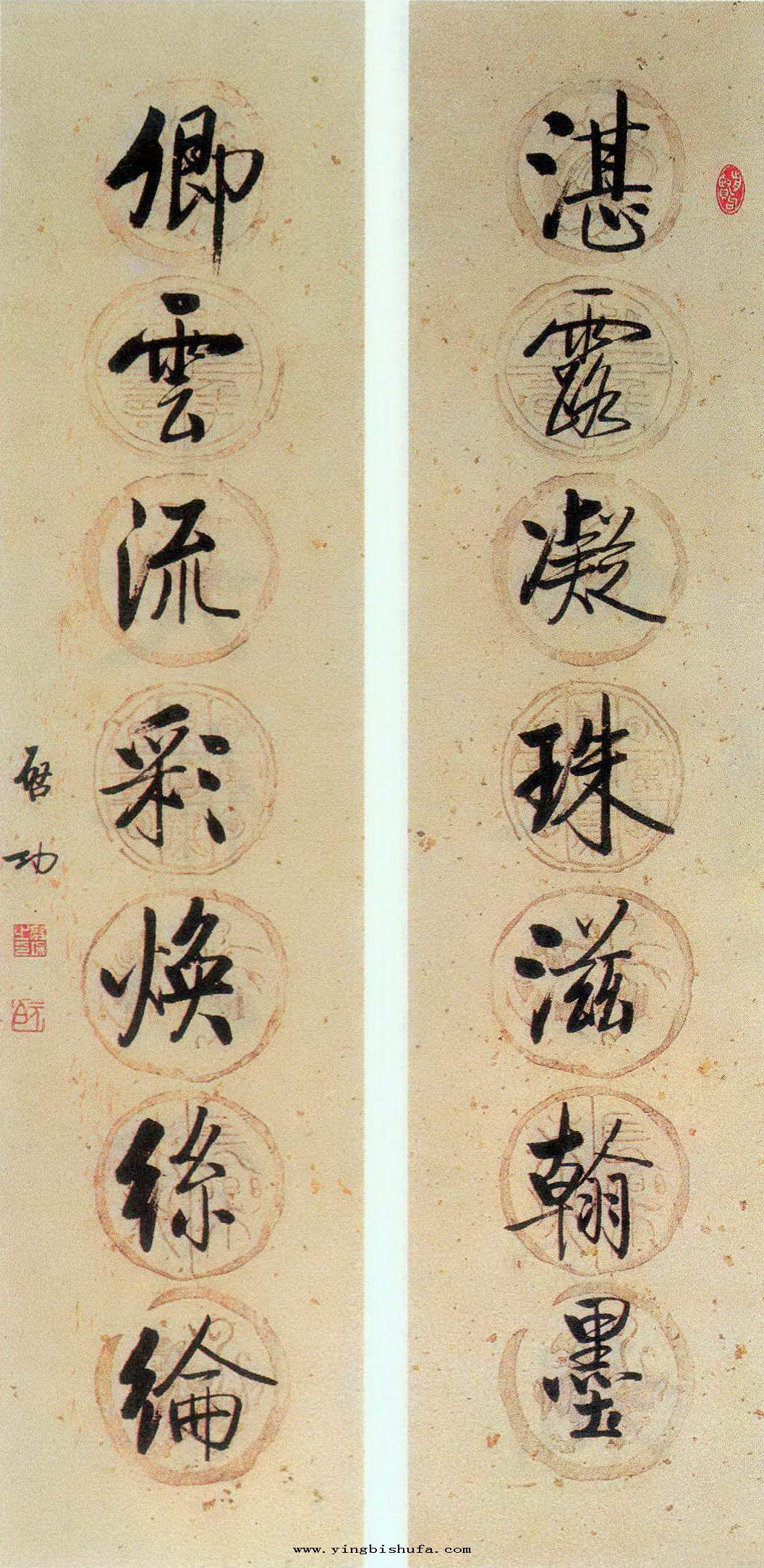 启功:楷书七言联(湛露凝珠滋翰墨卿云流彩焕丝纶)