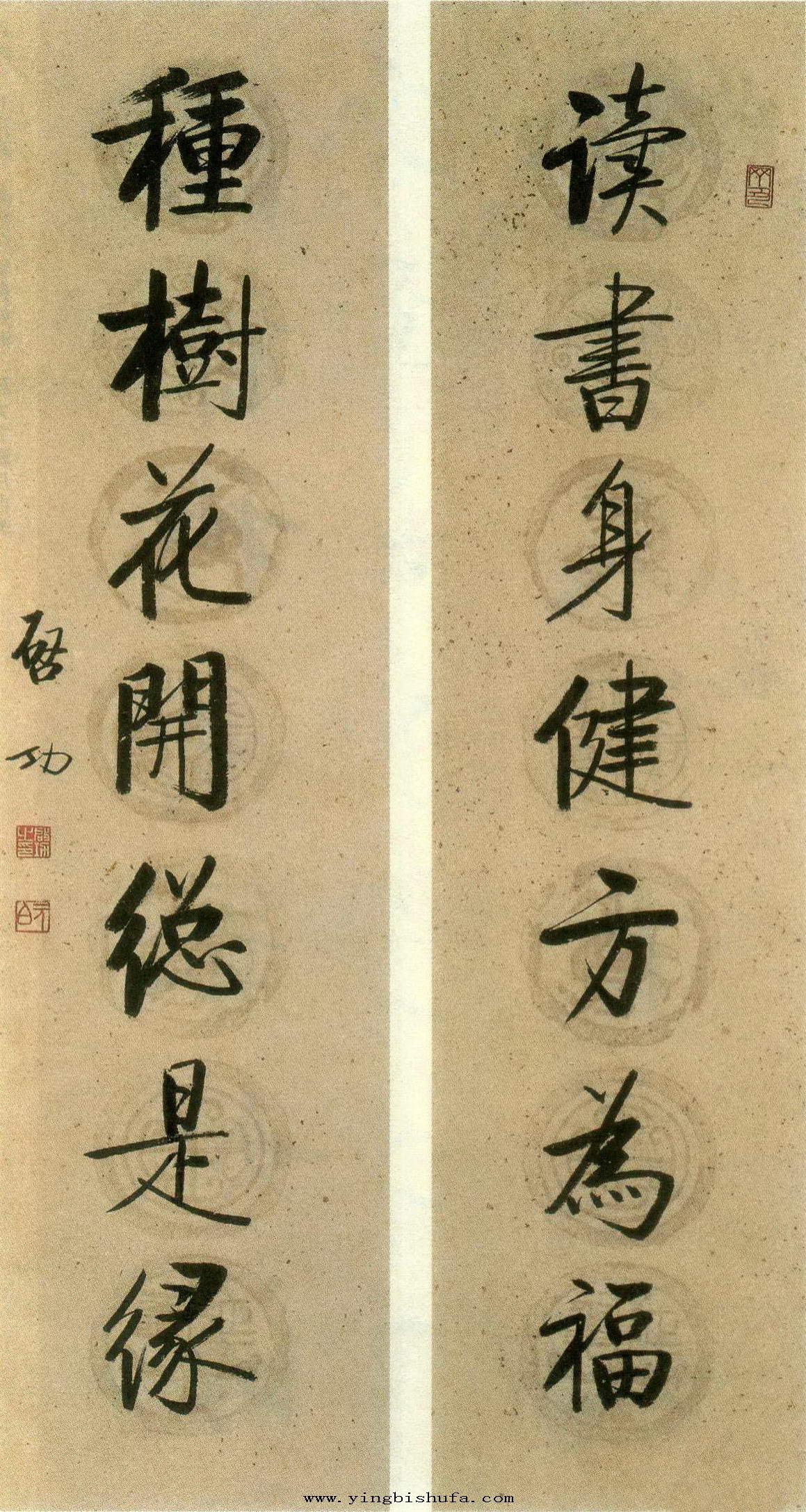 启功:楷书七言联(读书身健方为福种树花开总是缘)