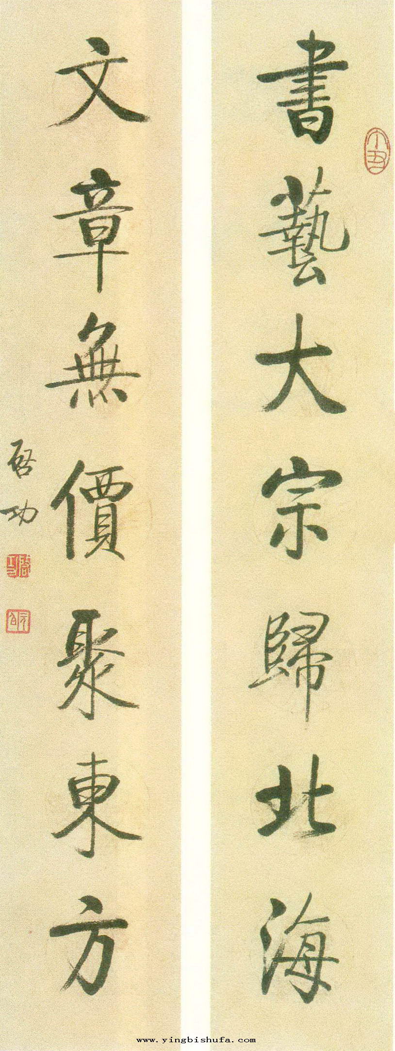 启功:楷书七言联(书艺大宗归北海文章无价聚东方)