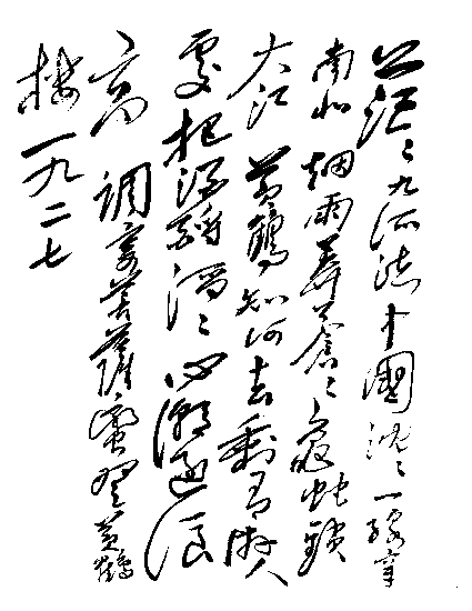 茫茫九派流中国,沉沉一线穿南北。烟雨莽苍苍,龟蛇锁大江。 黄鹤知何去?剩有游人处。把酒酹滔滔,心潮逐浪高! 1927春