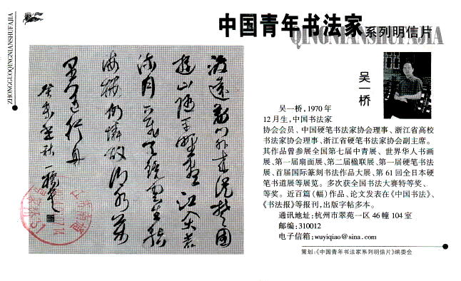 :中国硬笔书法家协会理事、浙江省硬笔书法家协会副主席