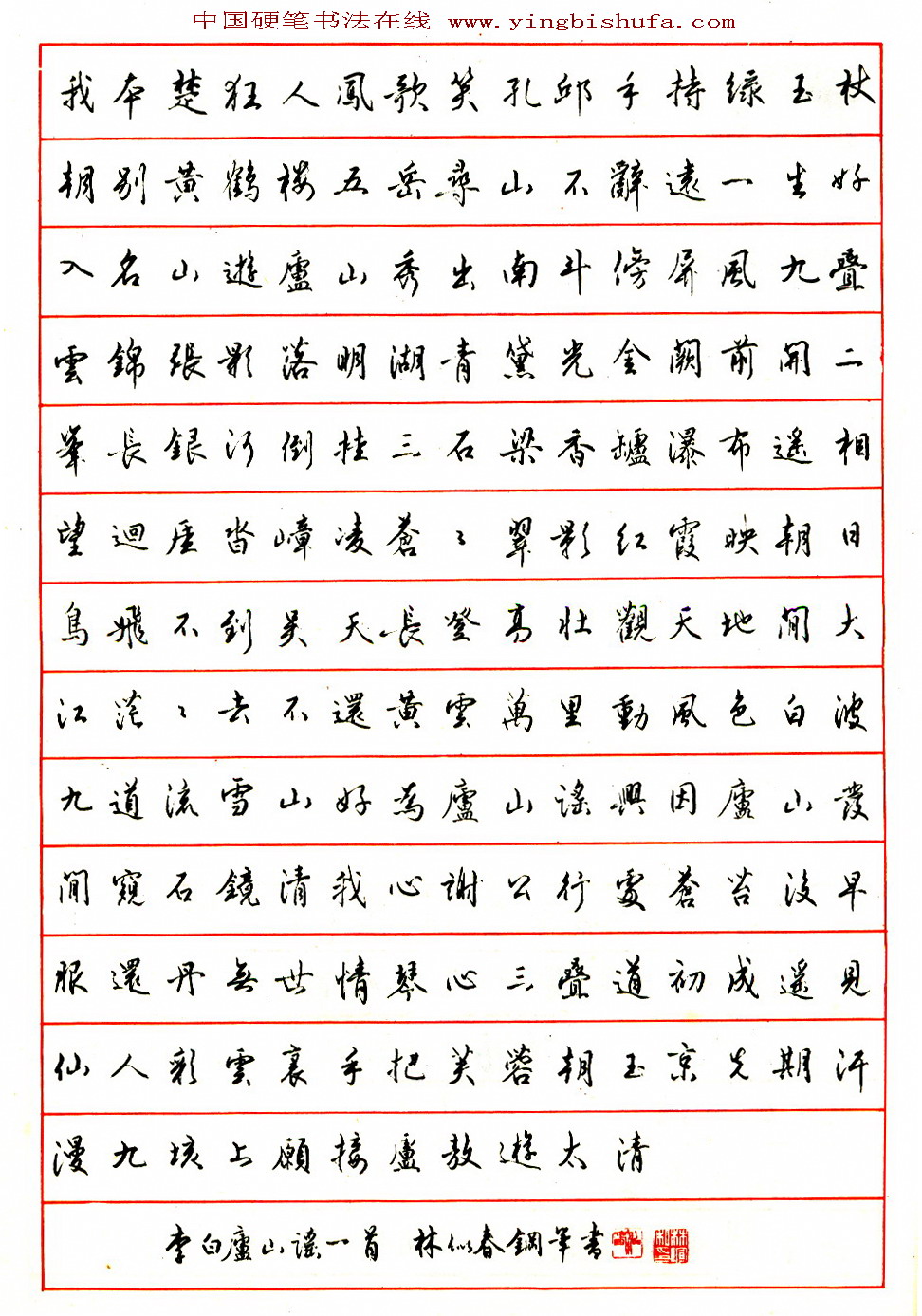 林似春硬笔行书李白庐山谣一首(来源:《中国钢笔书法杂志作品精选》)