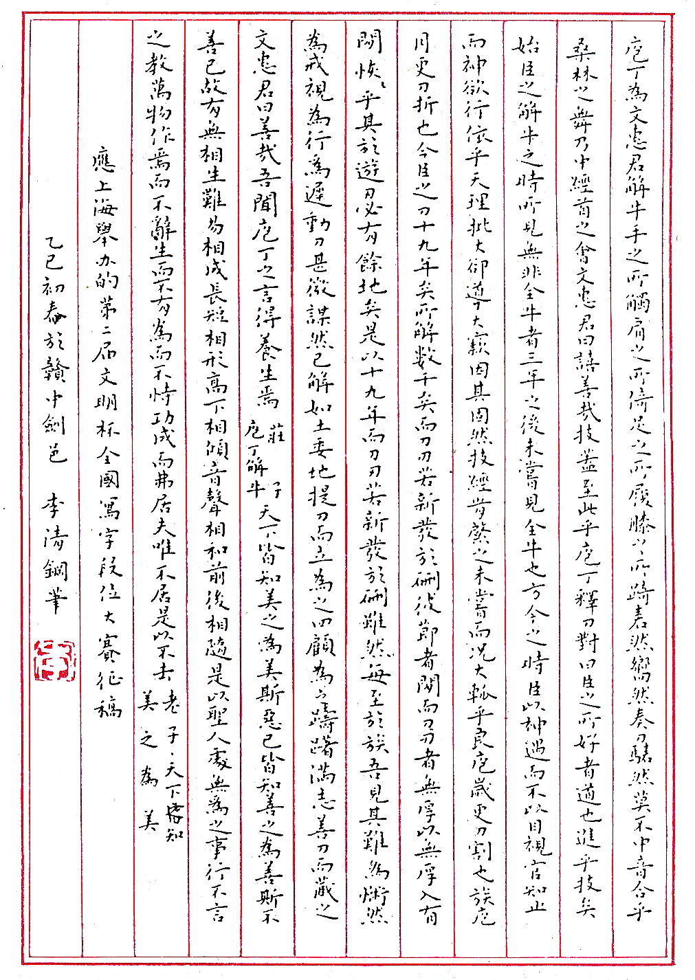 李清钢笔录《庖丁为文惠君角解牛》(来源:《钢笔圆珠笔正楷字帖》)