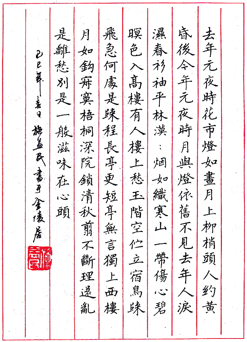 该作已得唐碑严谨工整之法。从整体看,最后三行胜于前者。落款稍高,章可略小。