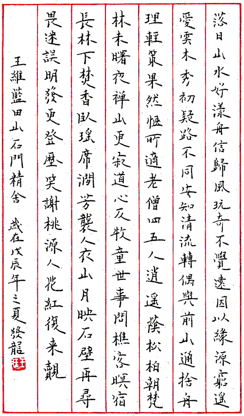 王发龙钢笔录王维《蓝田山石门精会》(来源:《钢笔圆珠笔正楷字帖》)
