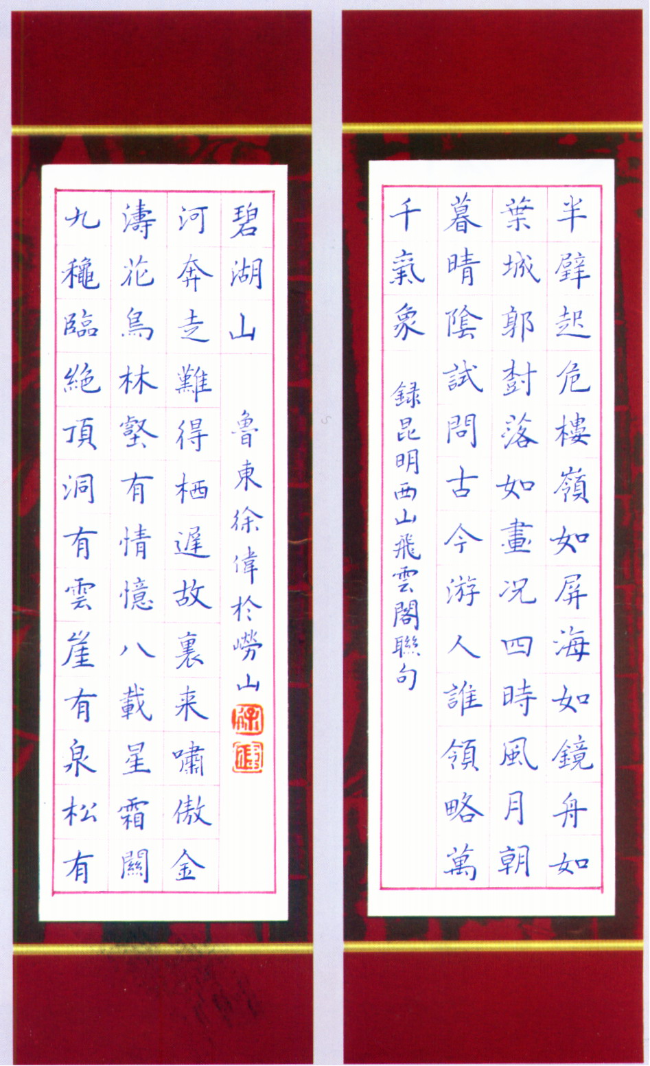 徐伟硬笔楷书昆明西山飞云阁联句(来源:《延兴杯哈尔滨市第二届硬笔书法大展暨全国名家作品邀请展作品集》)