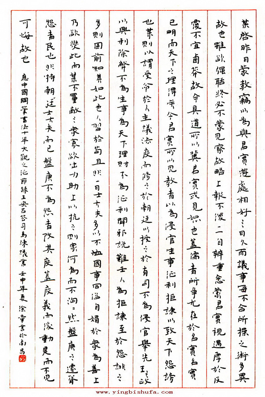 徐章硬笔楷书王安石答司马谏议书(来源:《中国钢笔书法杂志作品精选》)