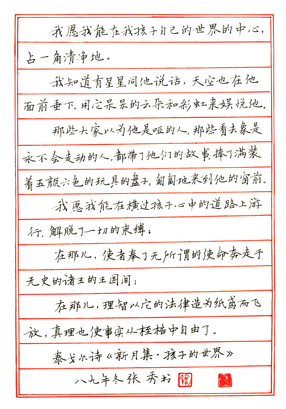 张秀硬笔楷书泰戈尔诗新月集孩子的世界(来源:《中国钢笔书法杂志作品精选》)