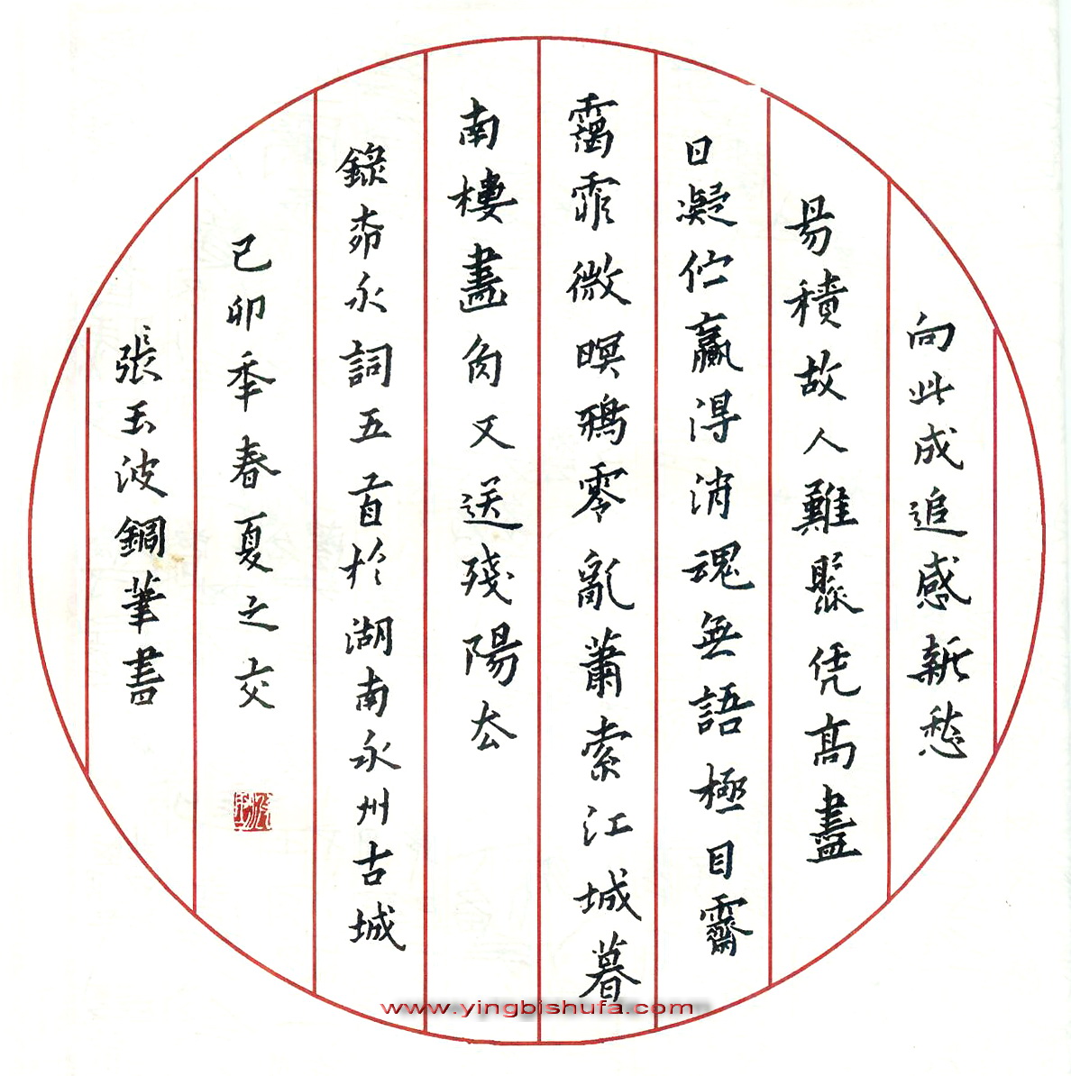 书宋代柳永词,幅式为仿团扇面之圆形,字体为楷书。此作明显受当代硬笔书坛老将谢非墨之影响,充分运用了美工笔(弯头笔)之粗细变化性能,多以露锋入笔,力求取得“运笔如刀”之效果,结构上多吸收魏晋古法,只是有几处尚有零乱、做作之感。(任平)