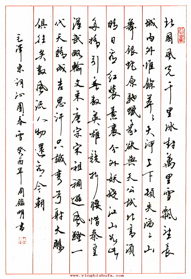 周鑑明硬笔行书毛泽东词沁园春雪(来源:《中国钢笔书法十年大观》)